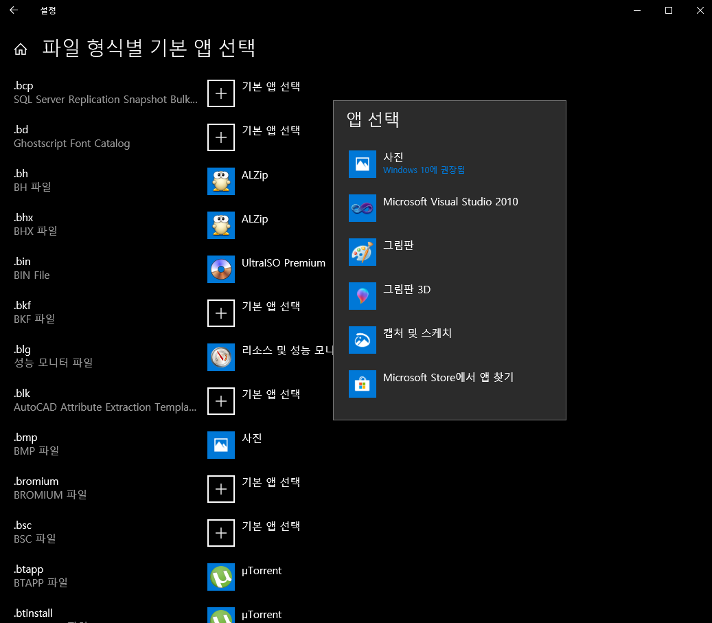 더 아래로 가면 파일 형식별 기본 앱 선택이 있습니다.