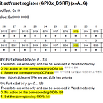 stm32 cortex-m3(STM32F103C8T6)led를 깜박여보자(1)!!!!! 글에서는 GPIOB_ODR 레지스터를 사용해서 LED를 깜박여 보았는데요.GPIOB_ODR 레지스터를 사용해서 LED를 깜박이면 레지스터를 32개 모두 건들여 주기 때문에 비효율적일 수 있습니다. 그래서 GPIOB_BSRR 레지스터를 사용해서 깜박여보도록 하겠습니다. GPIOB_BSRR레지스터를 사용하면 비트 1개만 건들여서 LED를 제어할 수 있기 때문에 실행속도가 매우 빨라집니다 #define RCC_BPB2ENR (*(volatile unsigned int*)0x40021018) #define GPIOB_BSRR (*(volatile unsigned *)0x40010C10) #define GPIOB_CRL (*(..